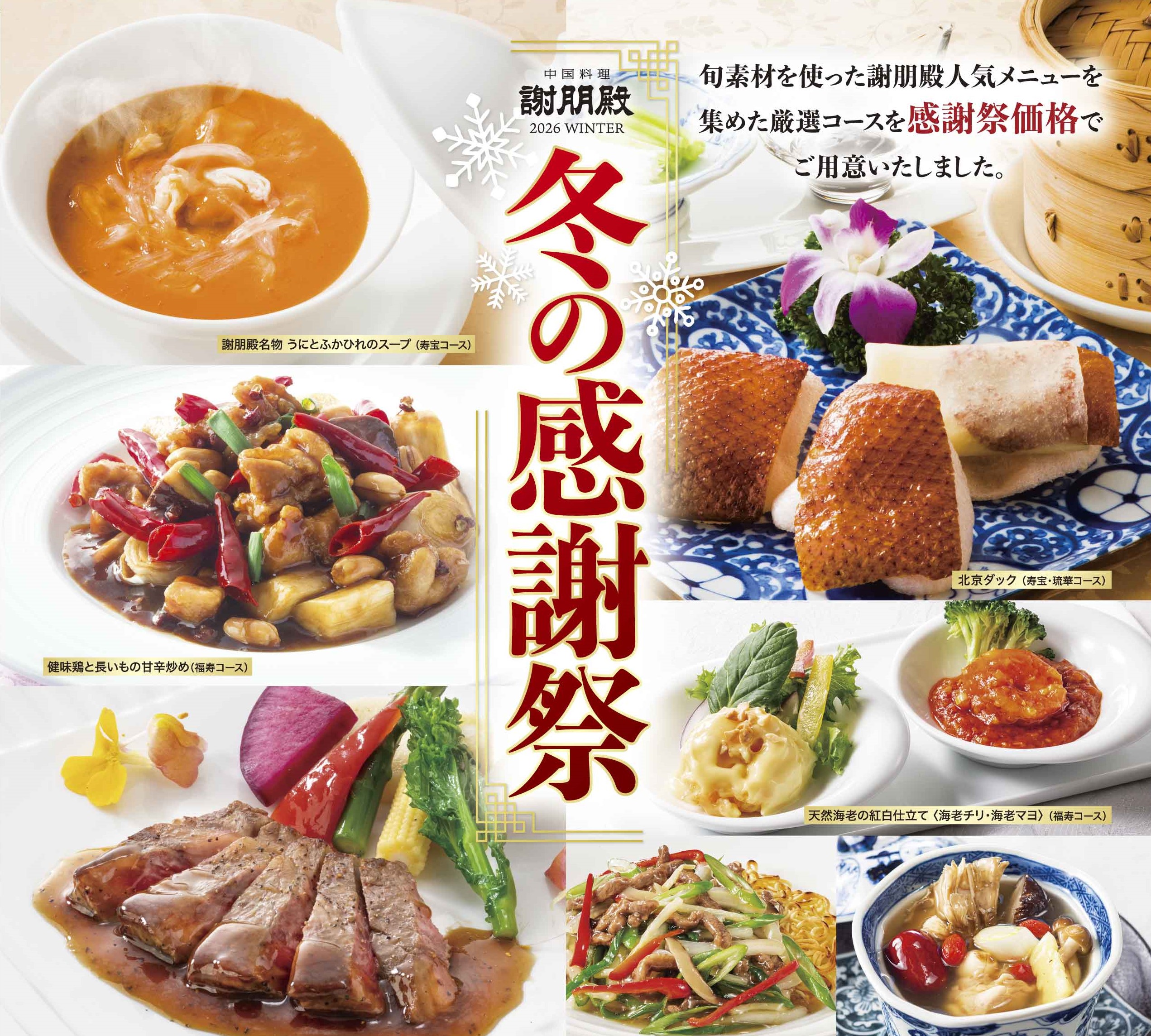 青森・旬素材を使用した謝朋殿人気メニューを集めた厳選コースを感謝祭価格でお楽しみいただけます。