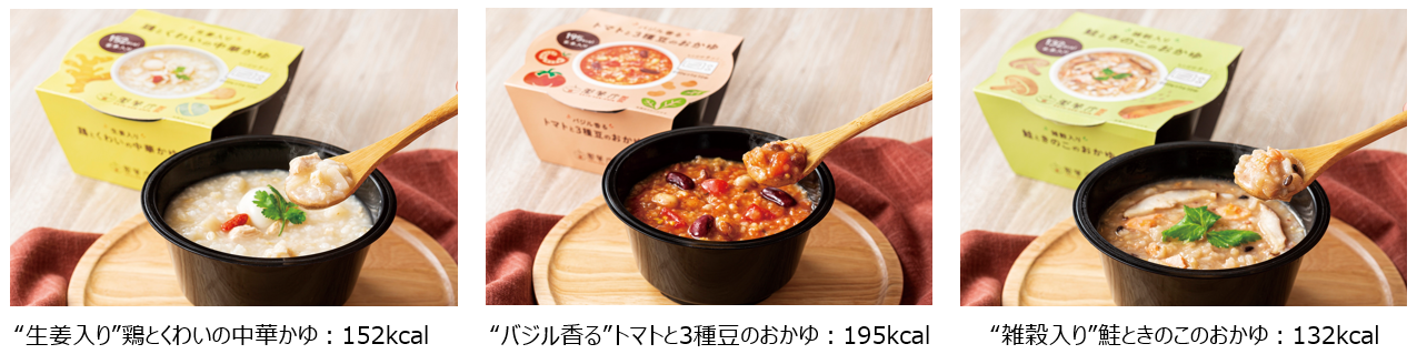 当メニューは、お好みに合わせて毎日でもお召し上がりいただけるおかゆを目指し、管理栄養士が開発した和洋中の3種をラインアップ。容器のまま電子レンジで70秒(600Wの場合)温めるだけで、からだに必要な栄養をやさしく、いつでも手軽にチャージできます。
